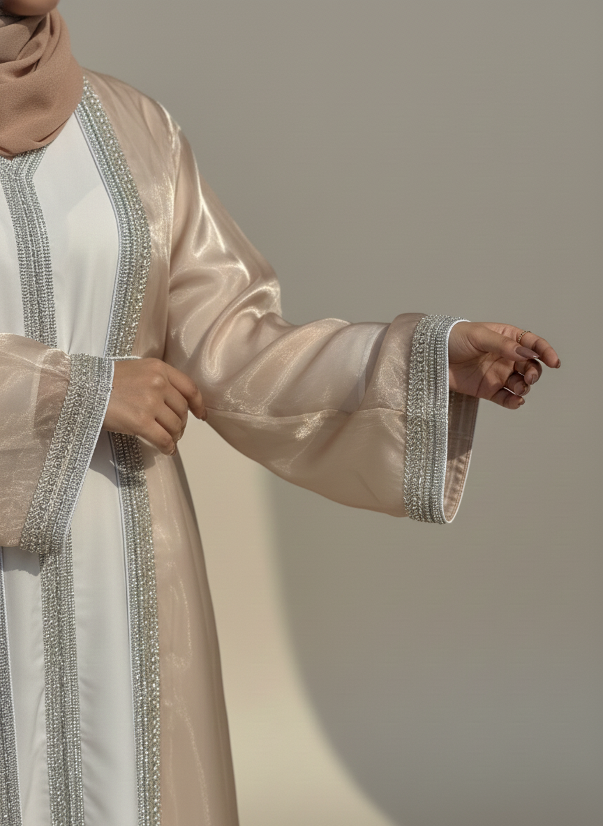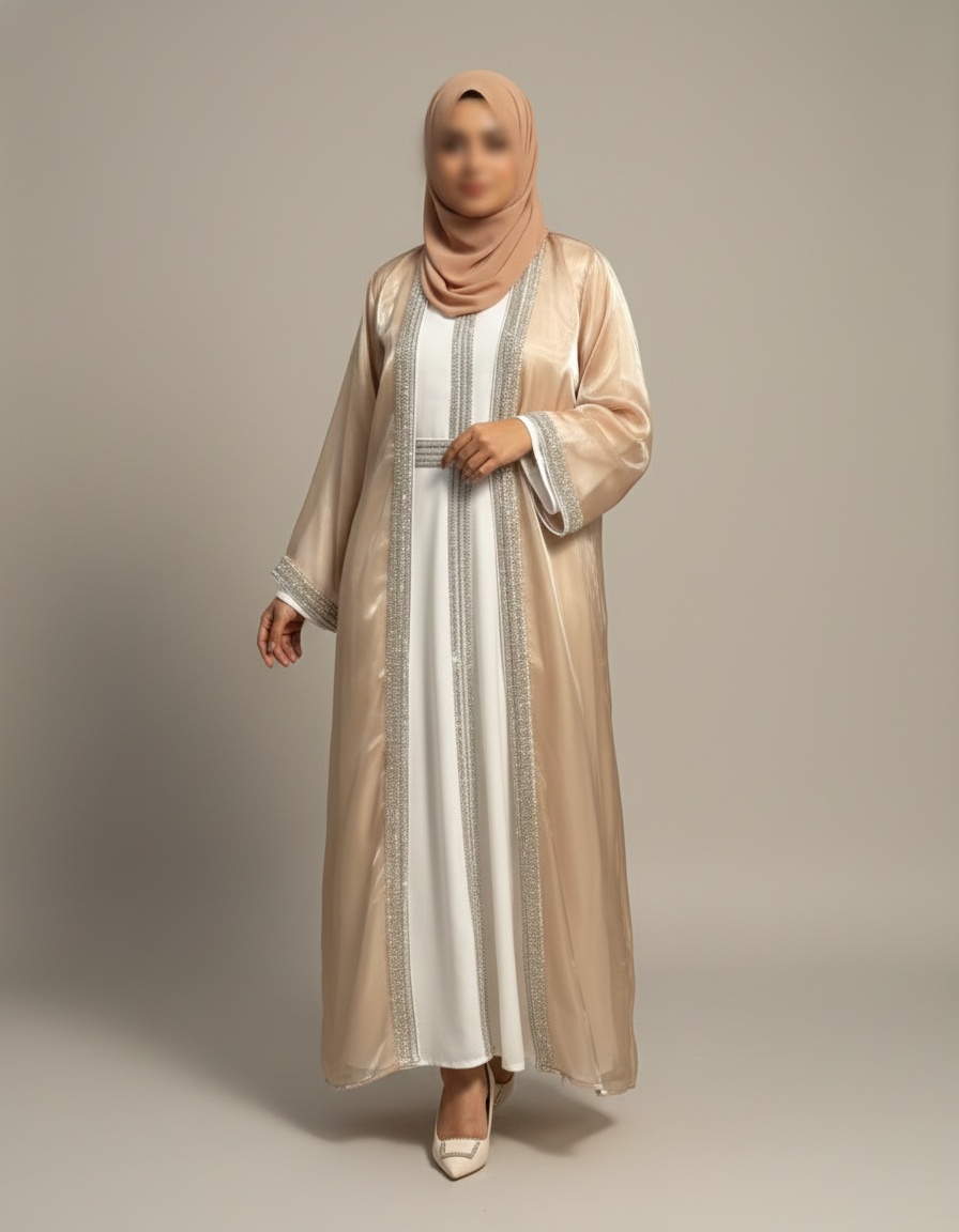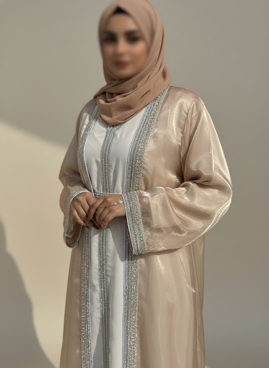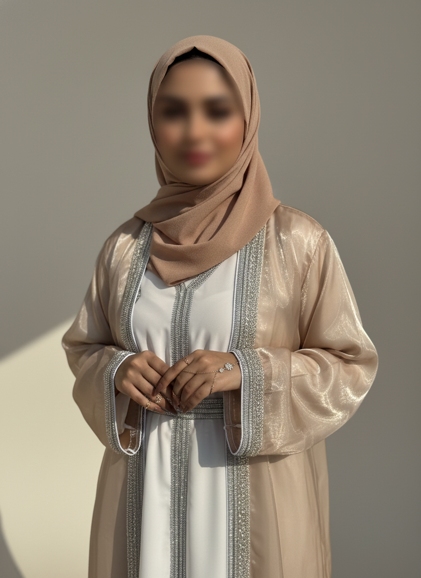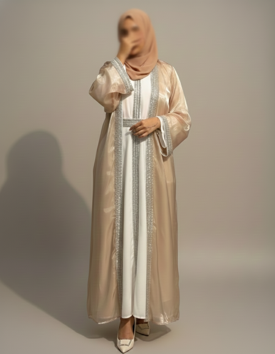 Radiating timeless grace with every sparkle, this 4-piece set features a crystal-embellished organza outer abaya, matching inner, detailed belt, and soft chiffon hijab. Designed to turn heads without saying a word — it’s bling, but make it divine.
