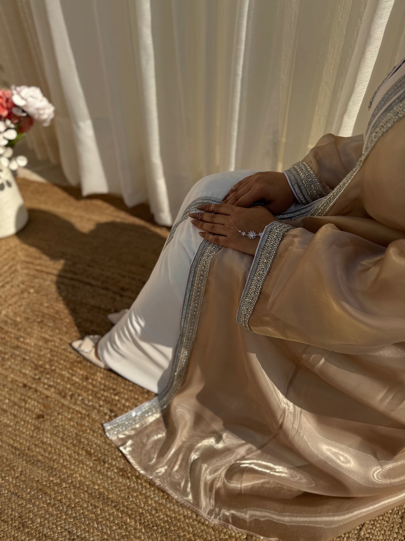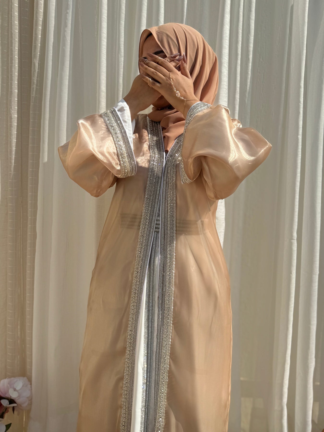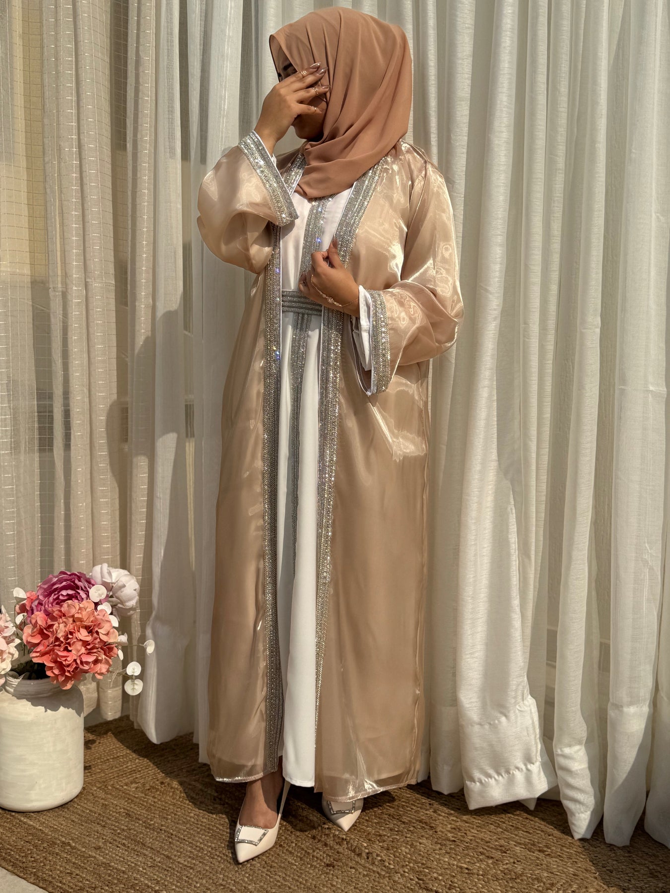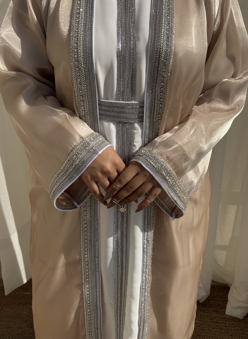 Radiating timeless grace with every sparkle, this 4-piece set features a crystal-embellished organza outer abaya, matching inner, detailed belt, and soft chiffon hijab. Designed to turn heads without saying a word — it’s bling, but make it divine.