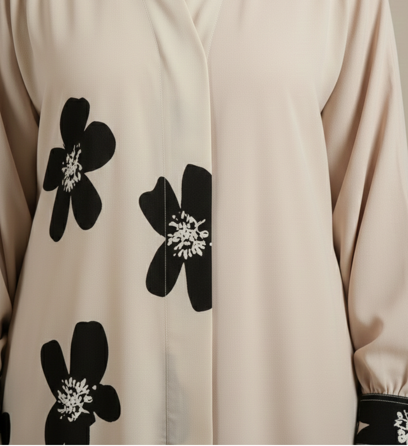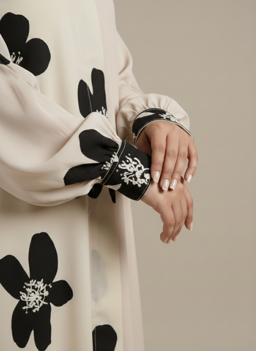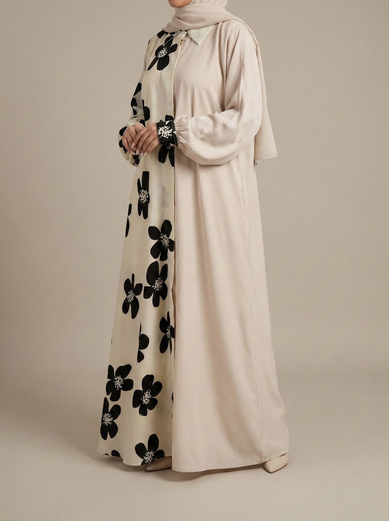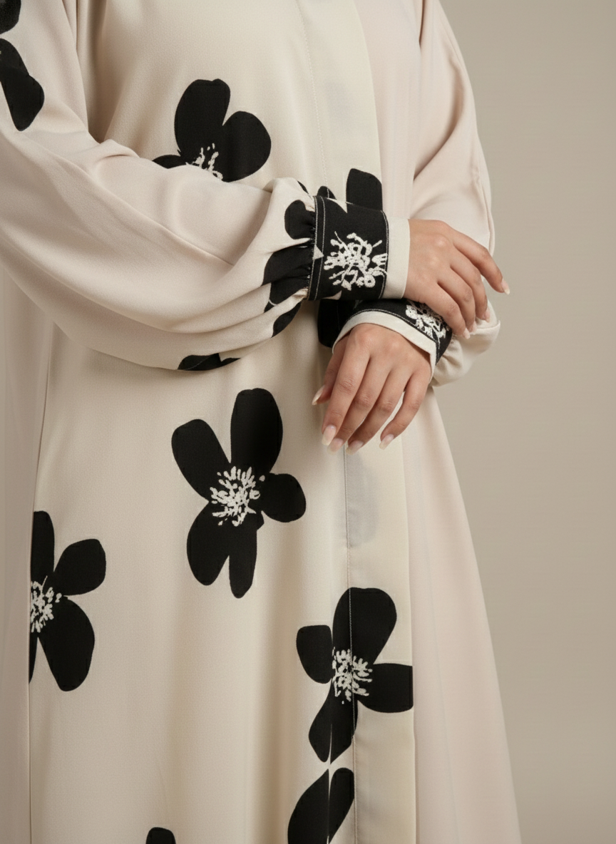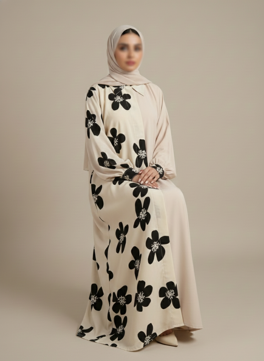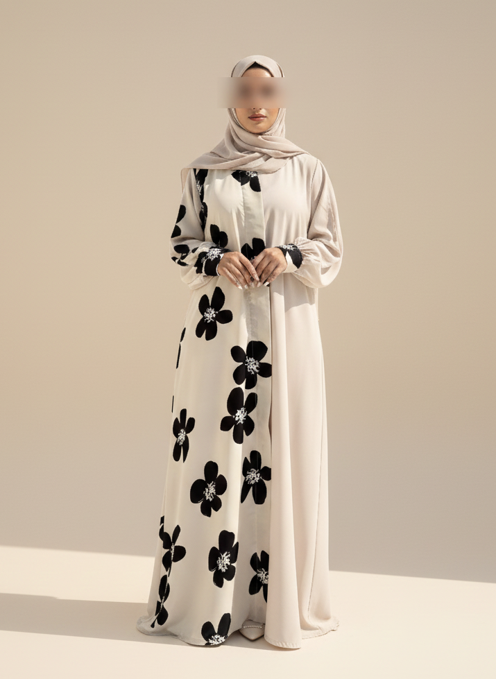 The premium black and white floral abaya is made in luxury beige printed Nida Fabric. It is a 2-pc chic abaya and chiffon hijab.