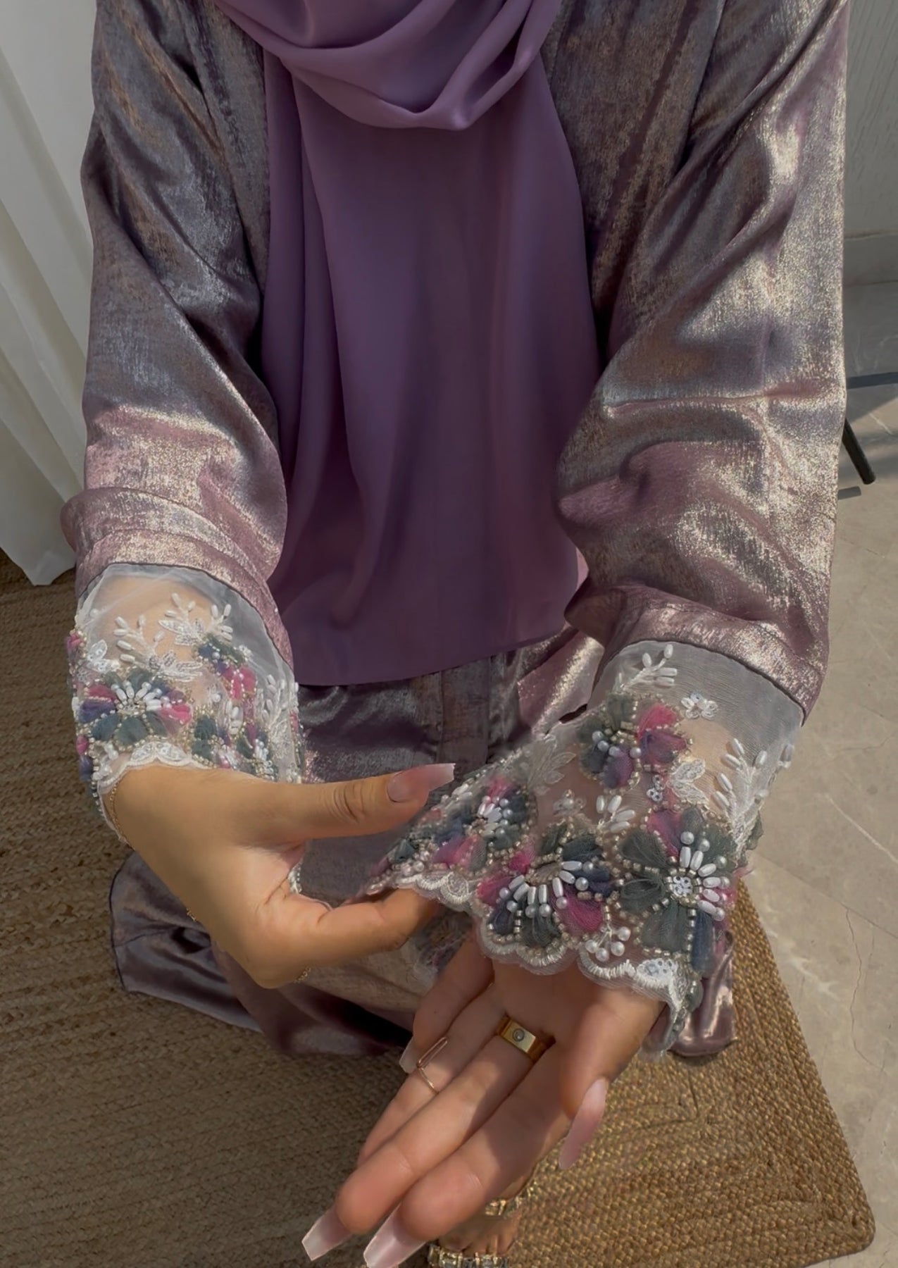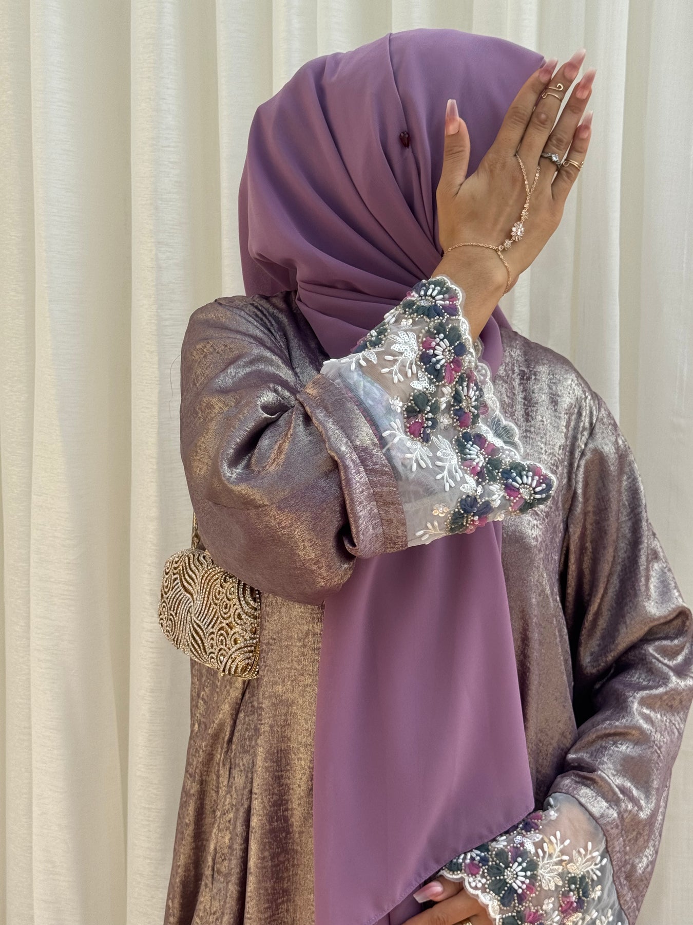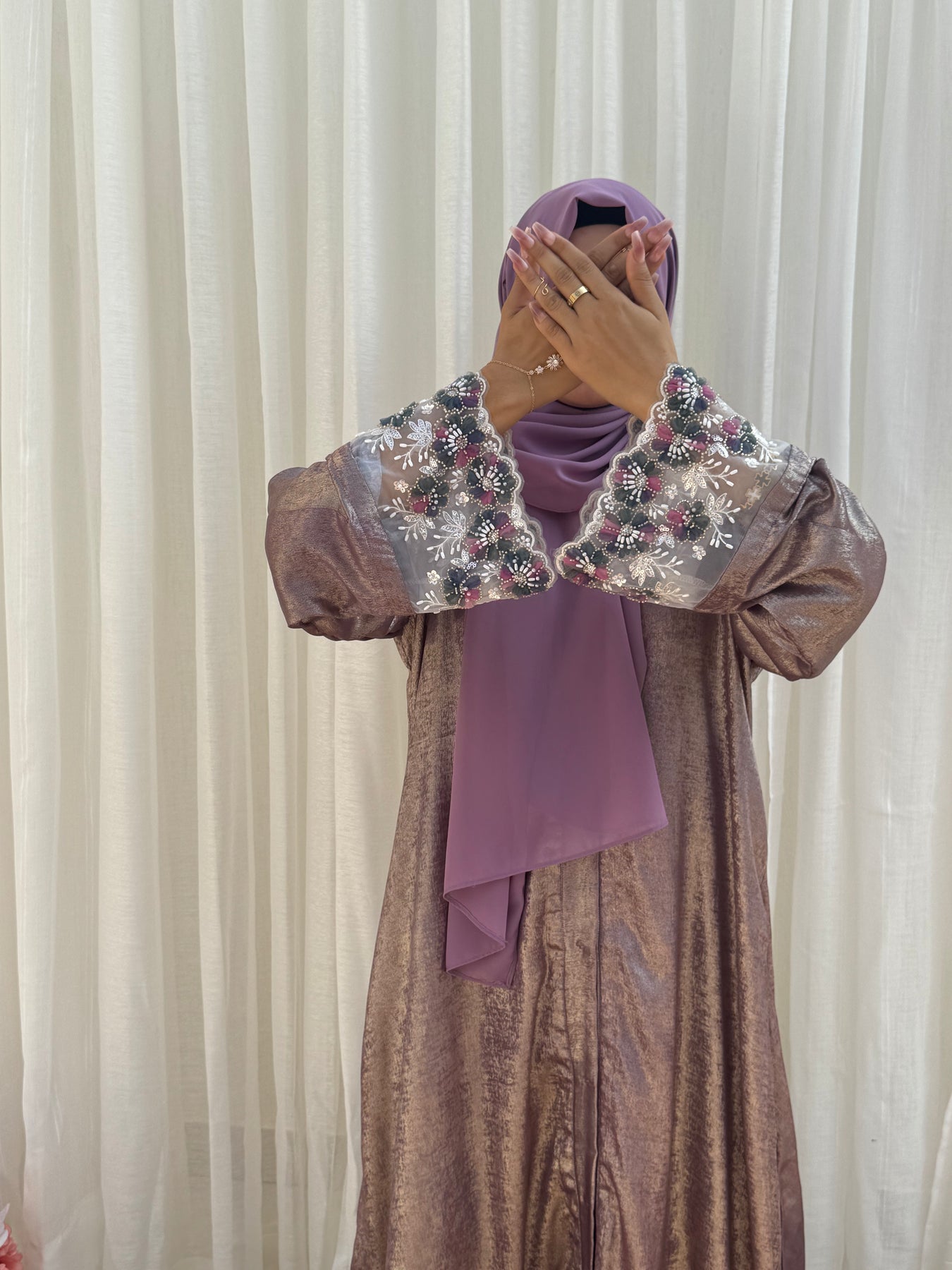 The lavender Royale abaya is crafted from rich, dull lavendar shimmery Dubai silk, radiating warmth and elegance. Its intricate embroidery on the sleeves pairs beautifully with the light purple chiffon hijab, completing this luxurious 2-piece ensemble.