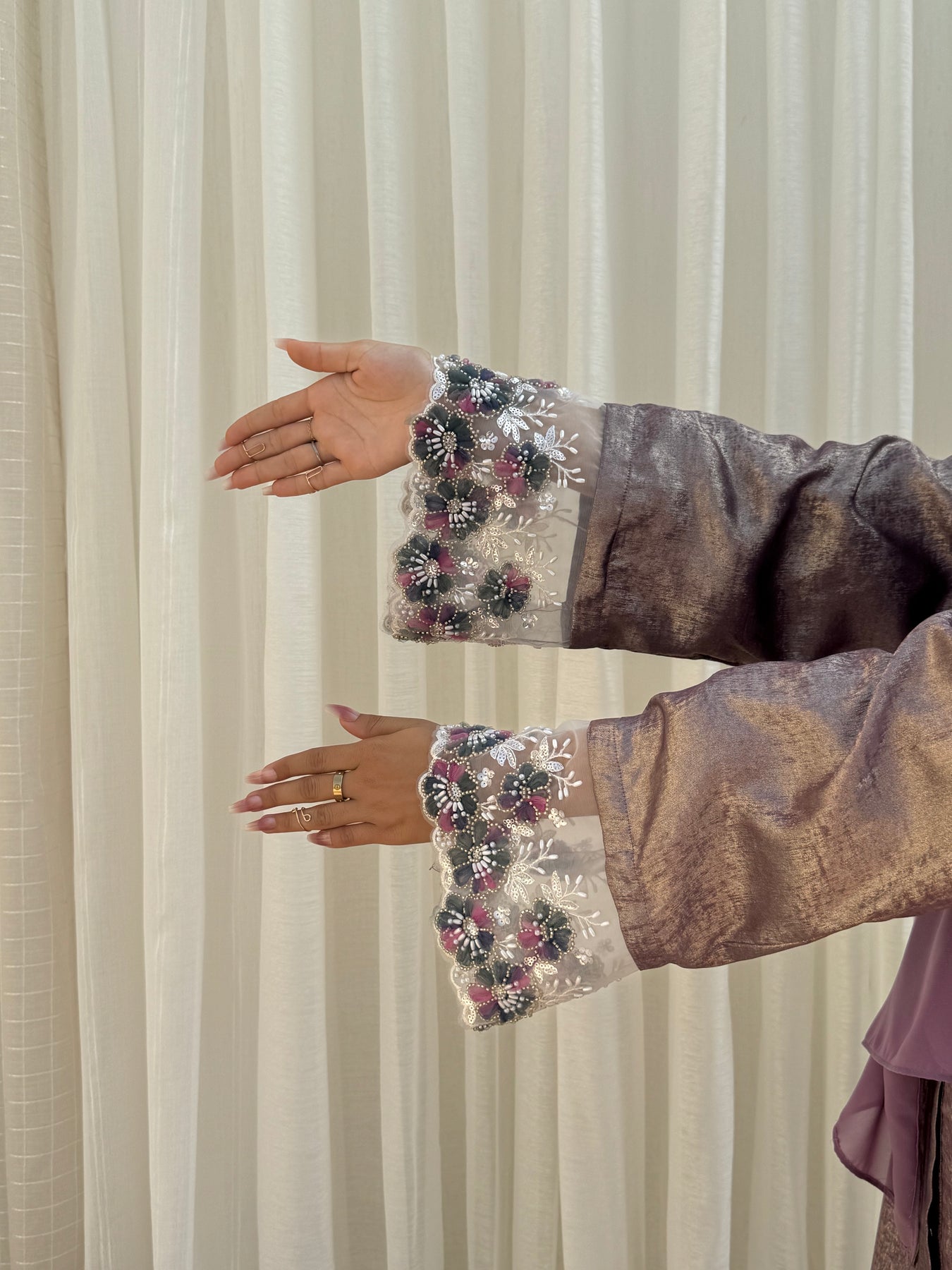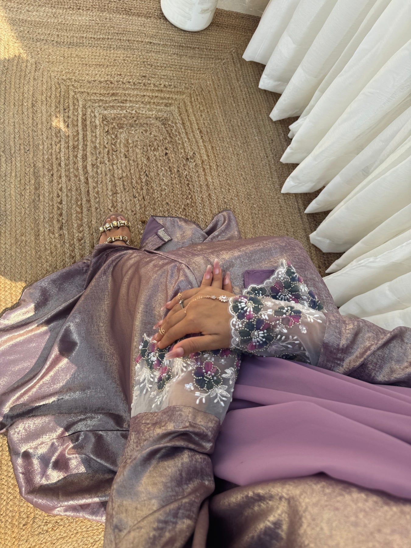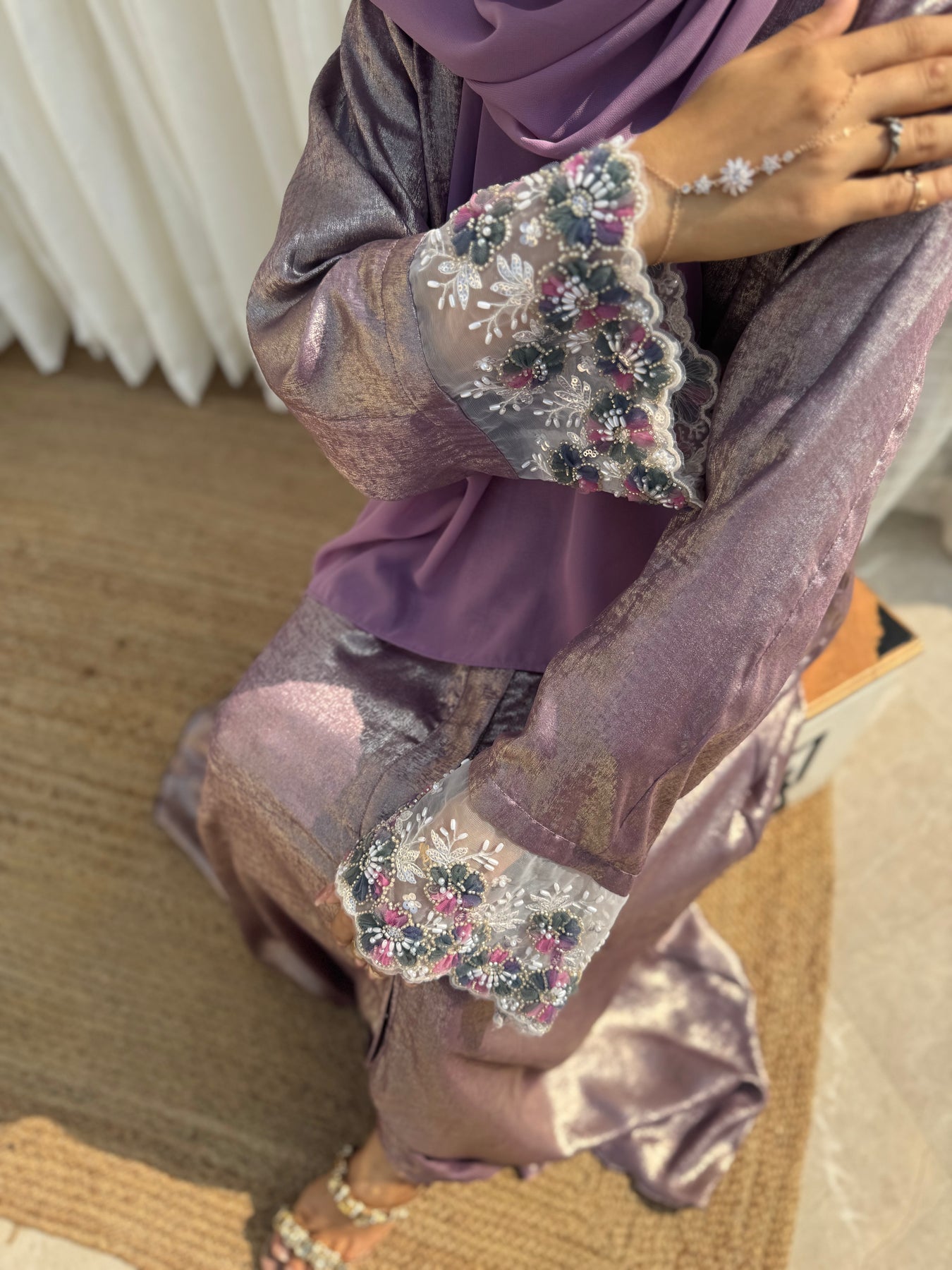 The lavender Royale abaya is crafted from rich, dull lavendar shimmery Dubai silk, radiating warmth and elegance. Its intricate embroidery on the sleeves pairs beautifully with the light purple chiffon hijab, completing this luxurious 2-piece ensemble.