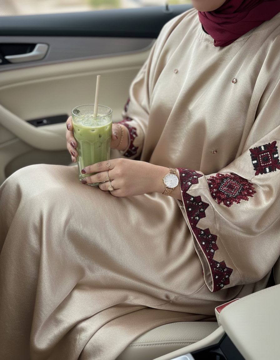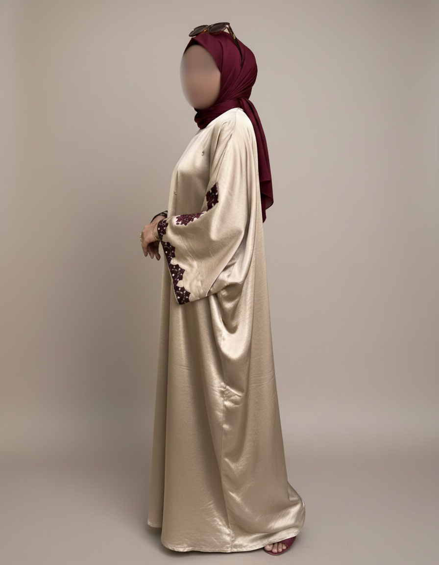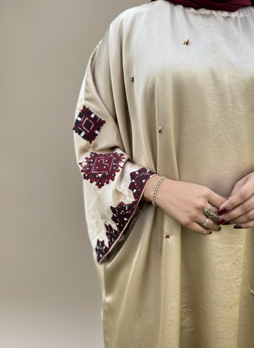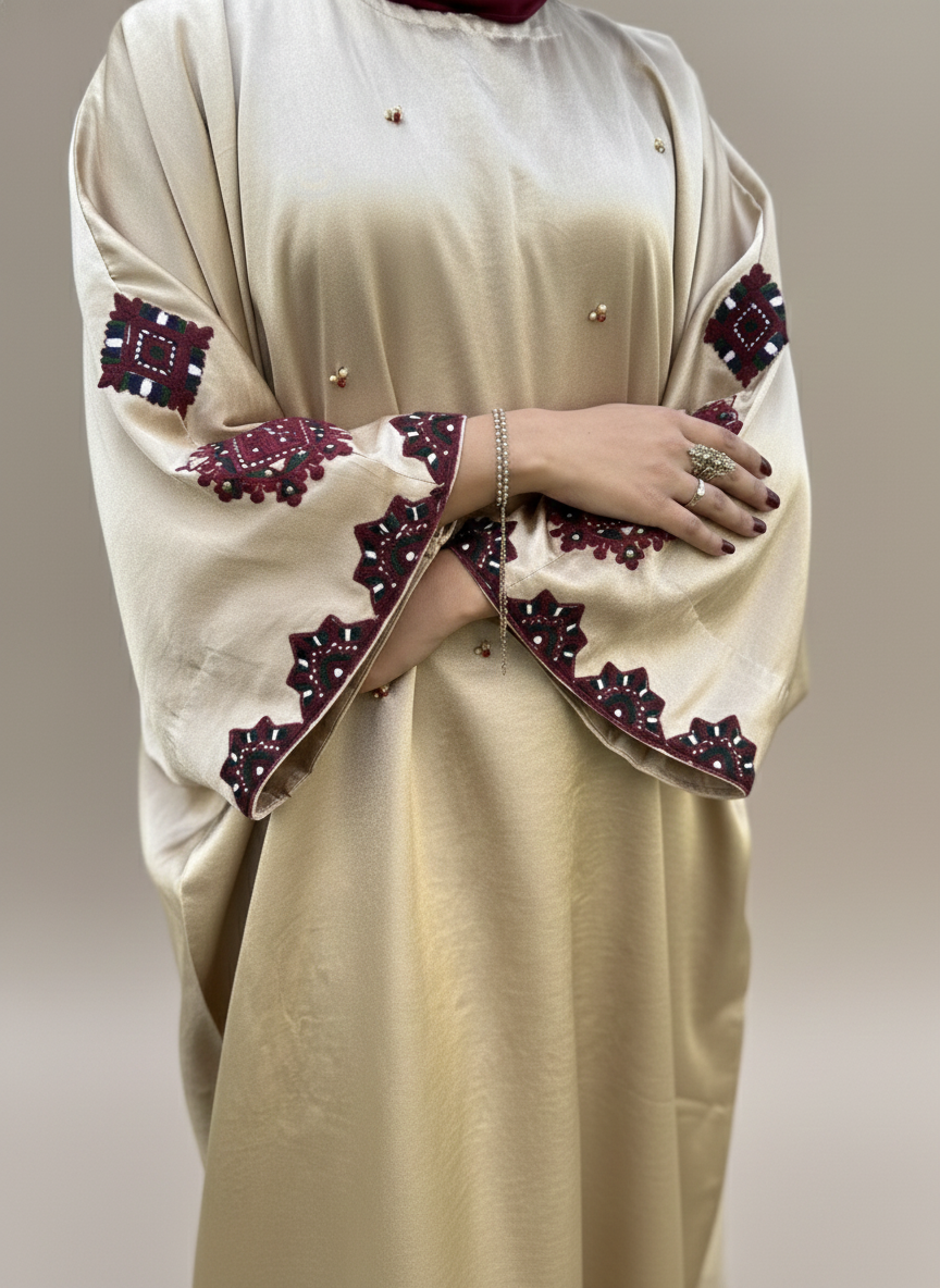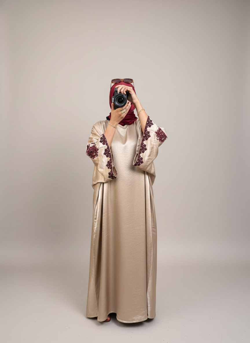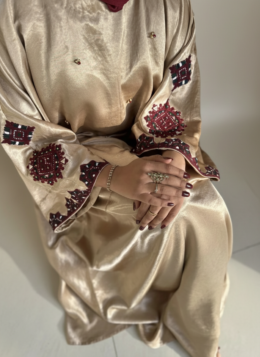 The Gold Royale abaya is crafted from rich, dull gold velvet silk, radiating warmth and elegance. Its intricate traditional embroidery on the sleeves pairs beautifully with the deep maroon chiffon hijab, completing this luxurious 2-piece ensemble.